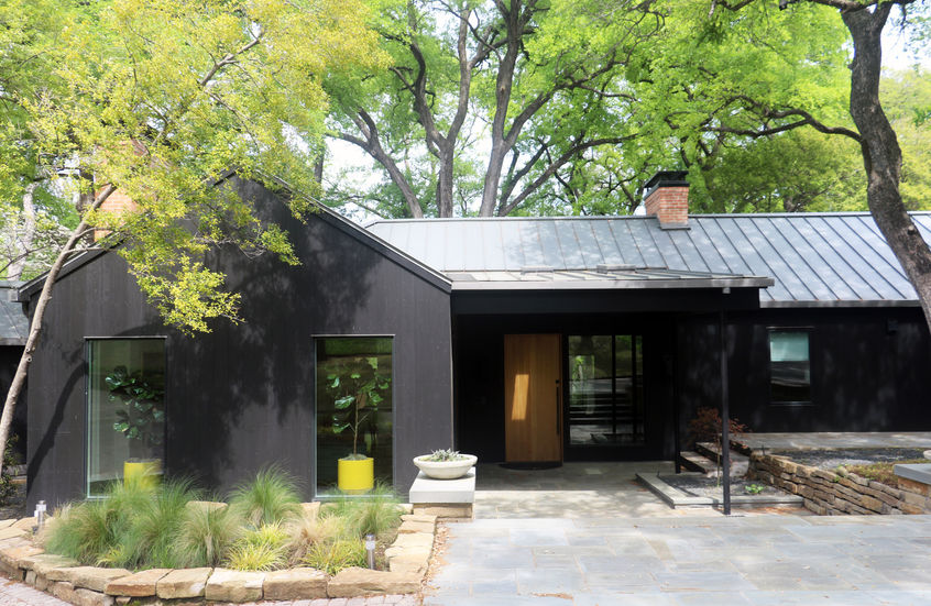 The exterior was re-skinned in standing seam roofing and Shou Sugi Ban vertical siding to give it a contemporary look. The large windows provide abundant natural light into the interior, while shading from the tree canopy limits solar gain.